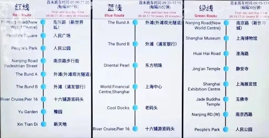 绿线:9:00-16:45 始发站:南京路(新世界城)(近南京西路地铁站7号口)