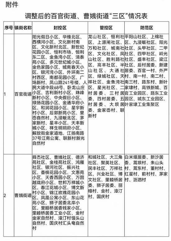 二、百官街道、曹娥街道范围内自12月7日以来,有确诊病例和感染者报告的社区(村居)除封控区外的部分区域调整为管控区。