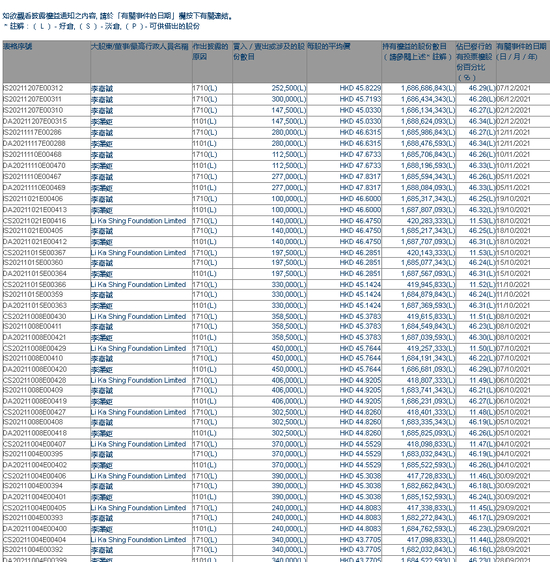 根据《证券及期货条例》,李嘉诚持有长实的权益由46.27%增至46.29%;李泽鉅所持权益由46.341%增至46.345%。