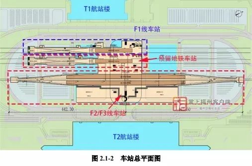 新建南、北进场路连接线地下市政配套工程,与机场交通中心(GTC)合建,布置在GTC地下,总建筑面积约10.18万平方米,其中F2/F3线车站为地下二层、双岛四线,有效站台长450米、宽15米;预留地铁线车站为地下二层岛式,有效站台长140米、宽14米。