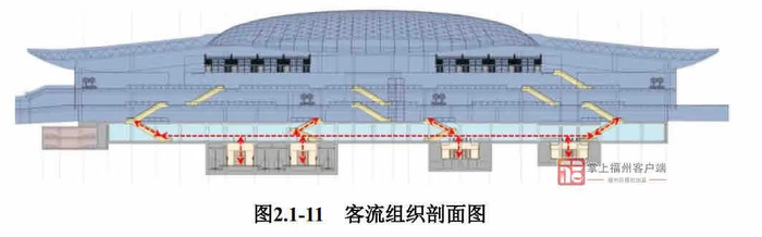 c.国铁与城市轨道交通换乘:国铁及地铁乘客通过负一层中轴换乘大厅实现国铁与地铁换乘。