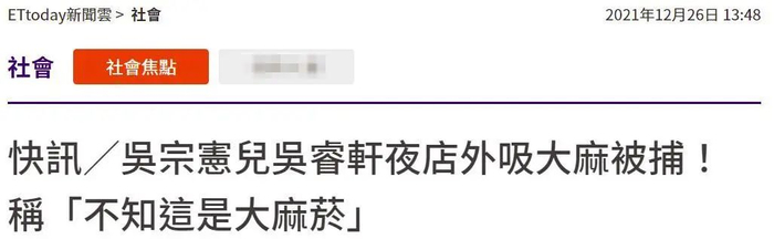 台媒:吴宗宪儿子夜店外吸大麻被逮捕,自称“不知这是大麻烟”