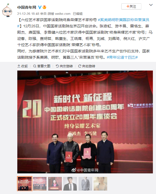 同时,为感谢院外艺术家们对中国国家话剧院多年来艺术生产创作的支持,国家话剧院授予奚美娟、胡歌、黄磊三人“荣誉演员”称号。#青年论道十四五#