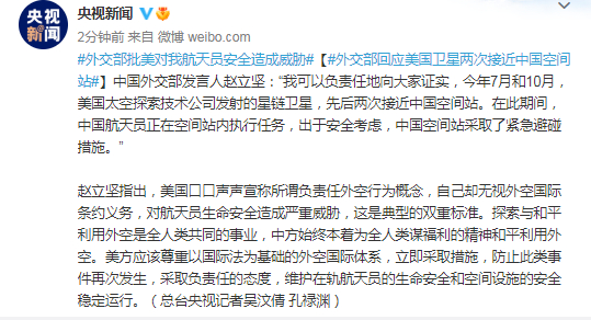 原标题:外交部回应美国卫星两次接近中国空间站
