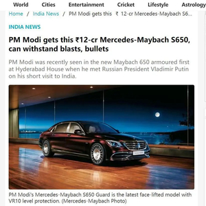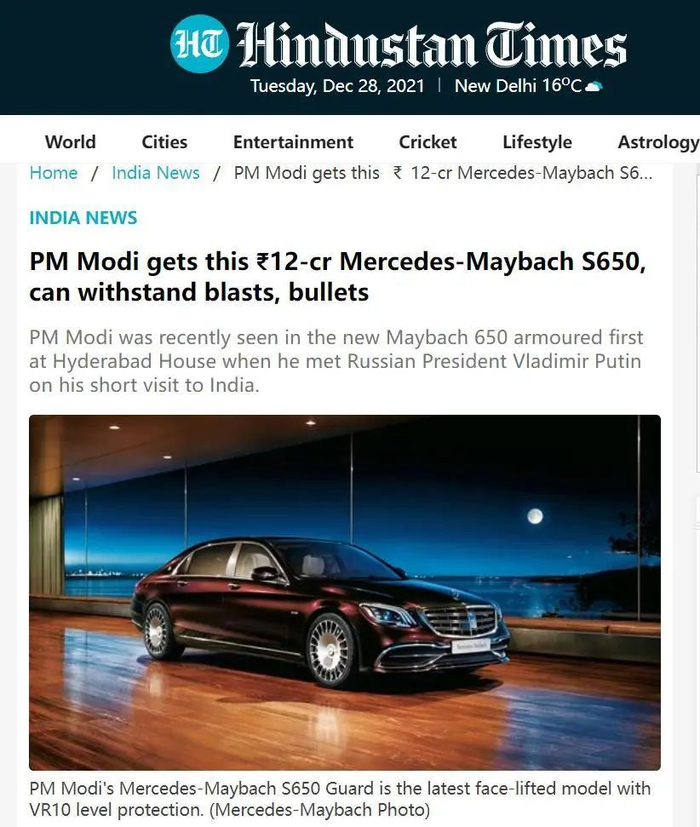 (《印度斯坦时报》:总理莫迪拥有了价值1.2亿卢比的梅赛德斯-迈巴赫S650,可承受爆炸、子弹)