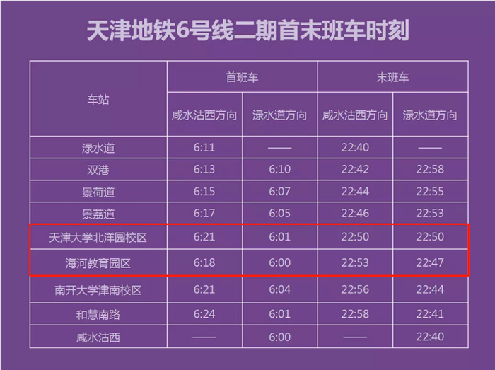 6号线二期运营时间为6:00—23:01 ,咸水沽西站首班车发车时间为6:00,渌水道站首班发车时间为6:11。渌水道站末班车发车时间22:40,终到站时间23:01,咸水沽西站末班车发车时间为22:40,终到站时间为23:01。