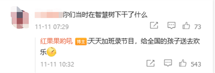 12月27日,央视少儿频道主持人“红果果”在微博发文,回怼网友“我就知道这两个人在智慧树下没干什么好事” 的发言,称其与搭档“绿泡泡”是正常恋爱生儿育女,“合法夫妻,一不偷二不抢,请问干了什么坏事儿?!”