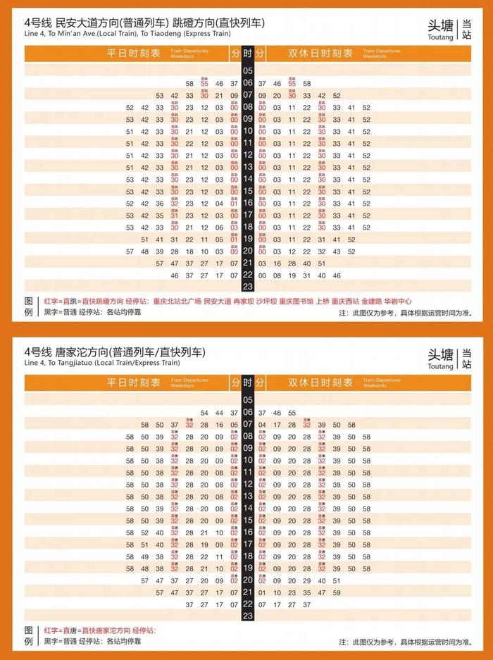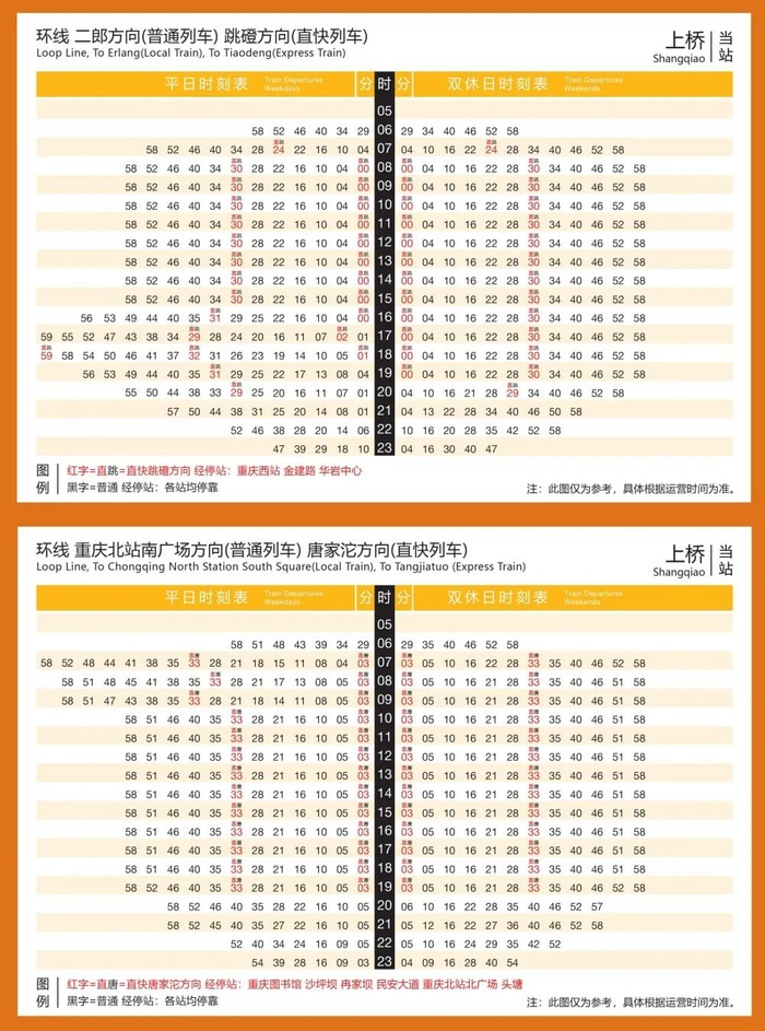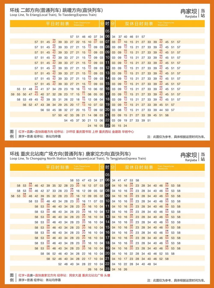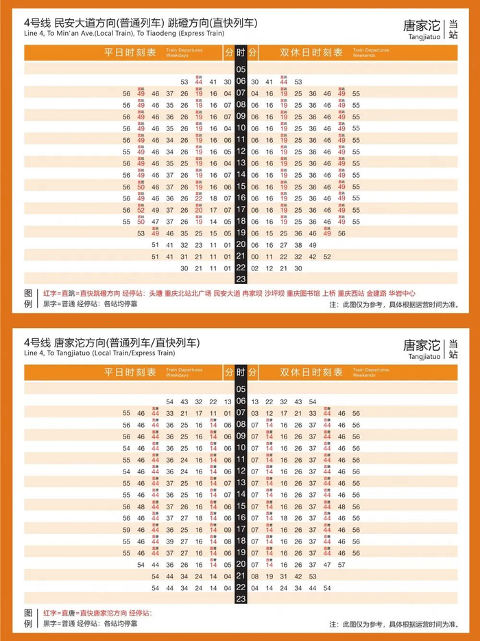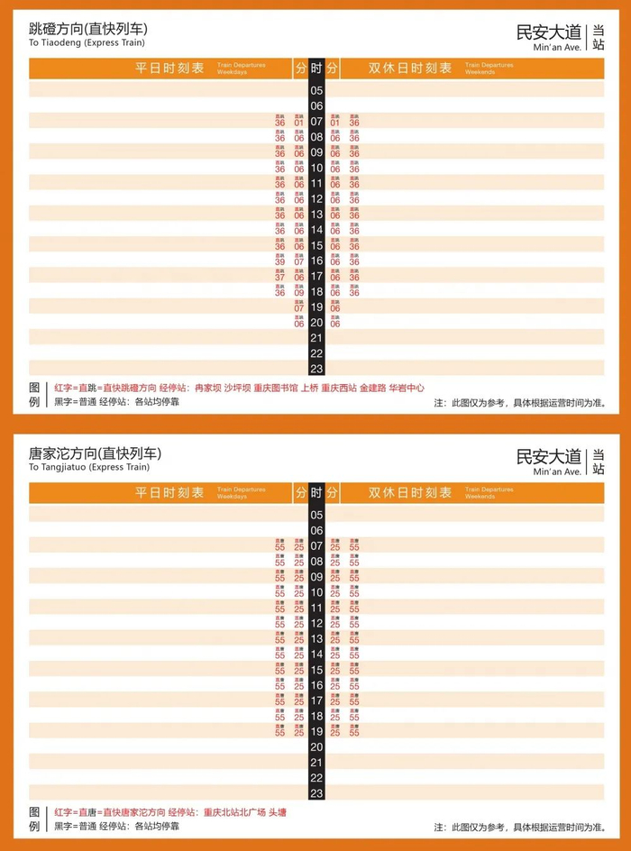 首班发车时间为06:44(唐家沱)、06:46(跳磴),末班发车时间为19:49(唐家沱)、19:16(跳磴),运行间隔约为30分钟。乘客无需换乘,乘坐直快列车从唐家沱至跳磴仅需59分钟。