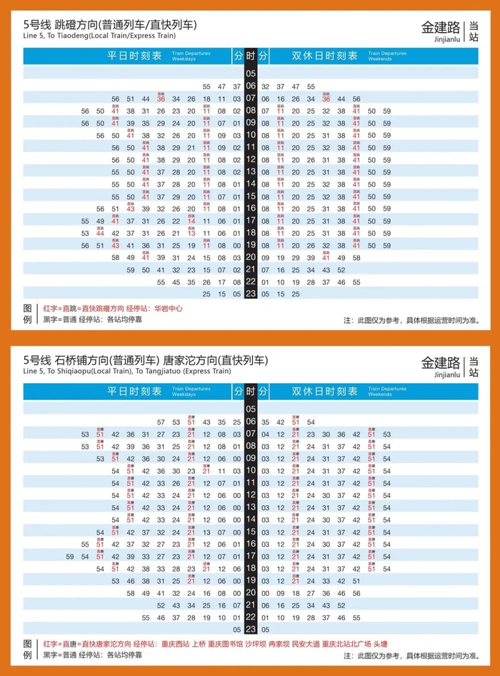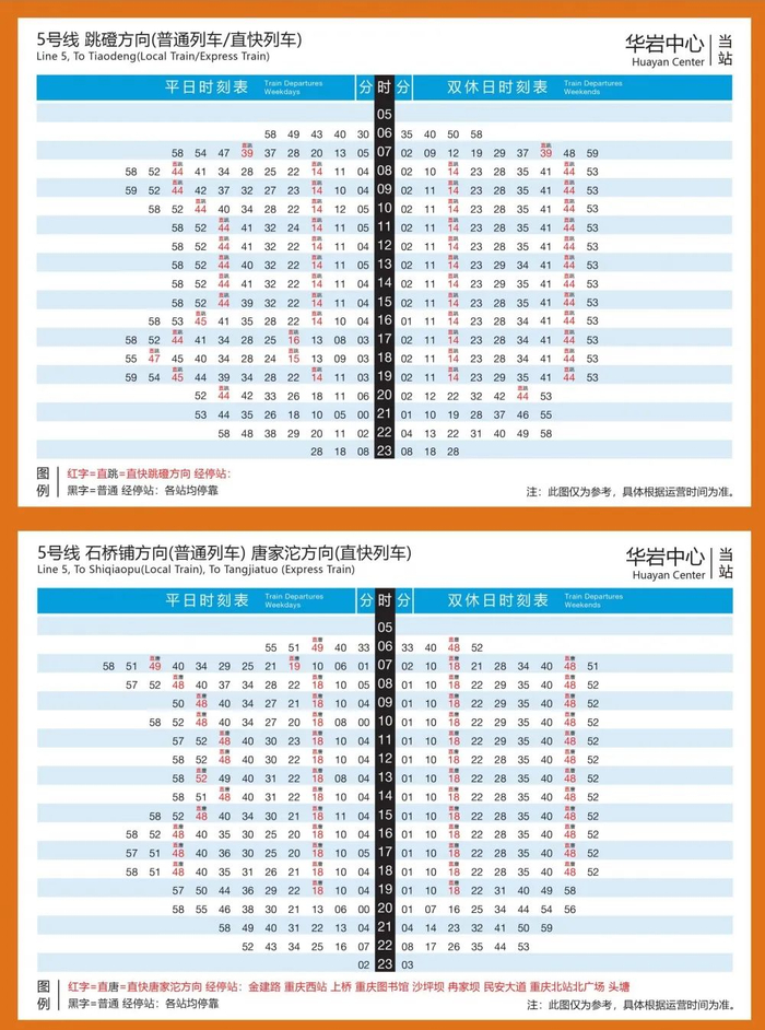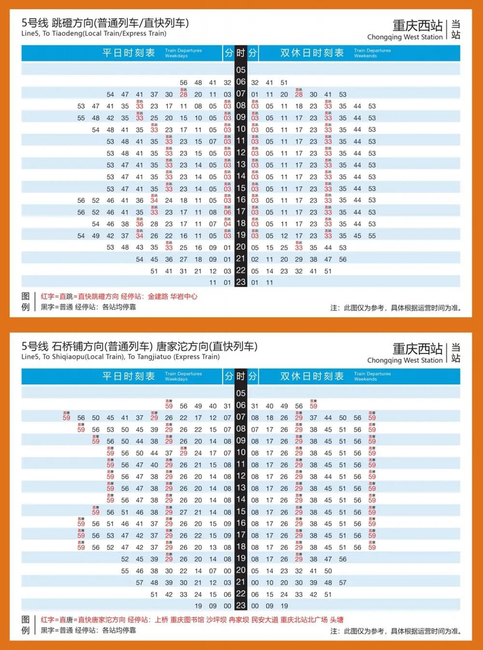 直快列车运营区段为唐家沱站~民安大道站~重庆西站~跳磴站,停靠唐家沱、头塘、重庆北站北广场、民安大道、冉家坝、沙坪坝、重庆图书馆、上桥、重庆西站、金建路、华岩中心、跳磴共12座车站,与普通列车相比,全程少停16个站,考虑平均候车及换乘步行时间,乘客至少可节约出行时间约33分钟,不仅更加快捷,还解决了当前5号线分段运营产生的必须通过换乘过江问题。