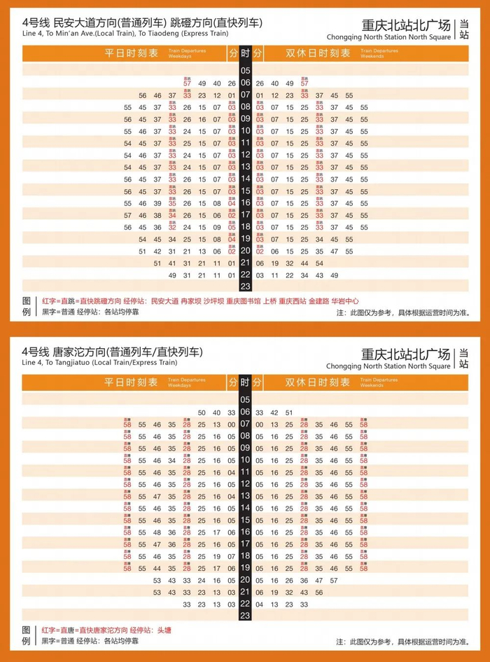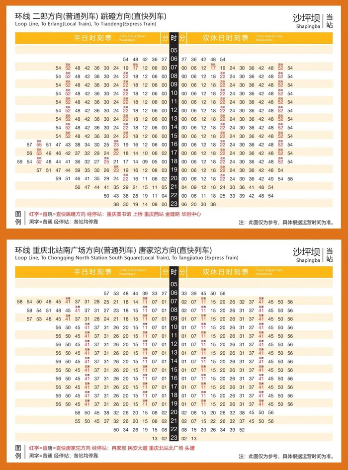直快列车平均每天有52列次,从唐家沱出发的首班列车时间是6:44,末班车时间是19:49;从跳磴出发是首班时间为6:46,末班车时间为19:16。