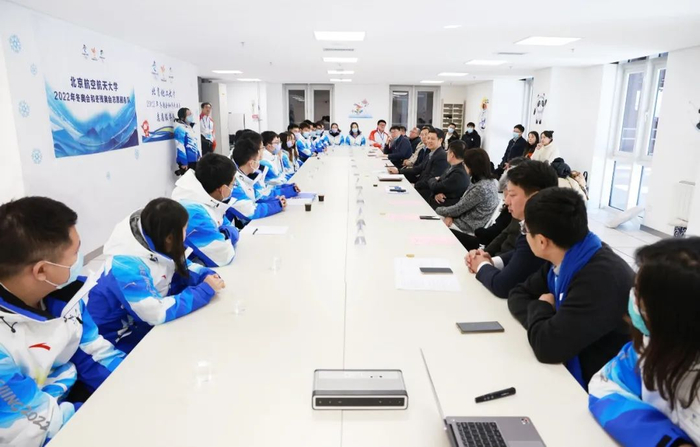 校团委书记庄岩就学校冬奥志愿者整体情况进行介绍。国家高山滑雪中心志愿者经理、北航守锷书院执行院长李广玉介绍场馆相关情况。