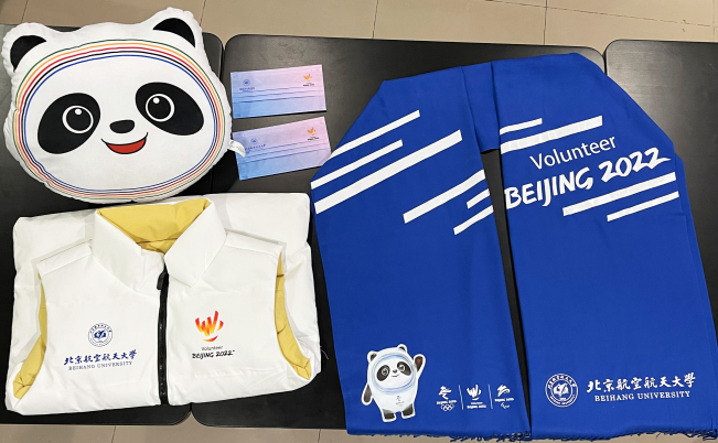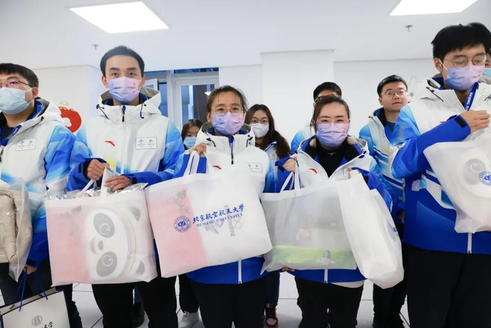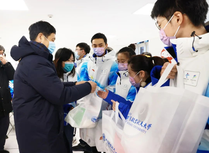 徐惠彬校长向志愿者赠送慰问大礼包,包含了由校长亲自设计的北航蓝志愿者围巾、印有冬奥志愿者标识和北航校徽的定制口罩和保暖羽绒背心、冰墩墩造型的暖手抱枕