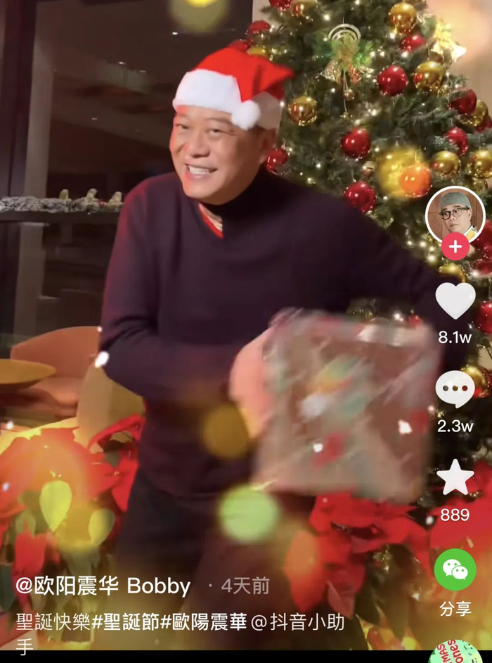 今年12月24日-25日,欧阳震华在微博和抖音发布了庆祝圣诞节的图片和视频。其中一个视频,他在装扮好的圣诞树前舞蹈,高兴地说“圣诞快乐”。
