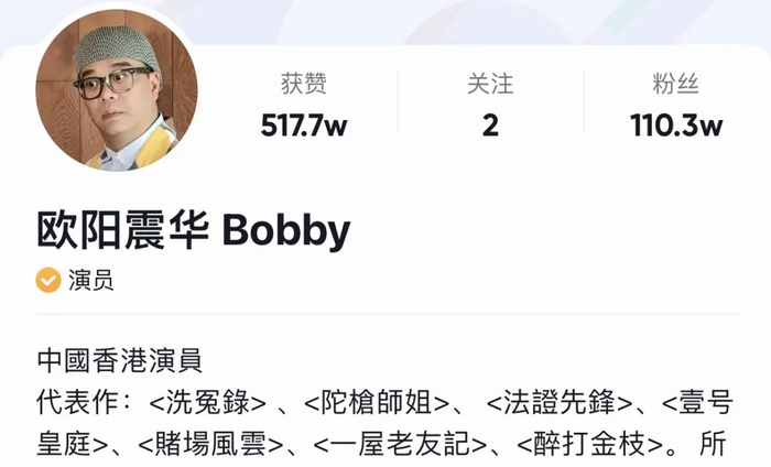 在欧阳震华抖音主页,其简介显示为中国香港演员。
