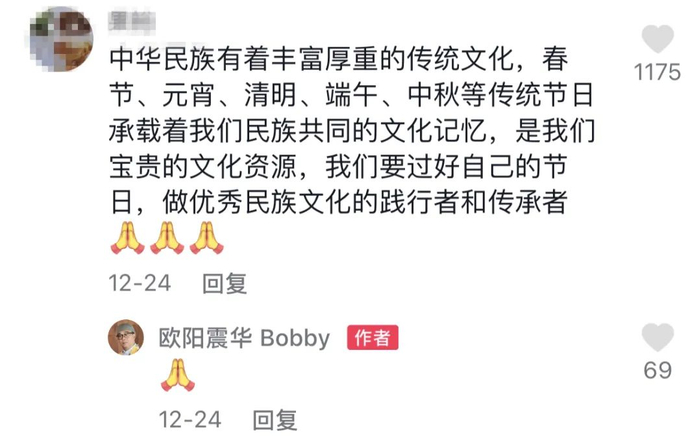此外,还有用户表示,比起西方节日,中国人更应该过好自己的节日,“做优秀民族文化的践行者和传承者”。对于这些建议,欧阳震华一一予以回应。