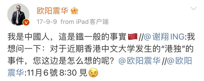 2017年9月,香港中文大学“港独”标语一事引发关注后,有网友就此询问欧阳震华的看法,欧阳震华回答称:“我是中国人,这是铁一般的事实。”
