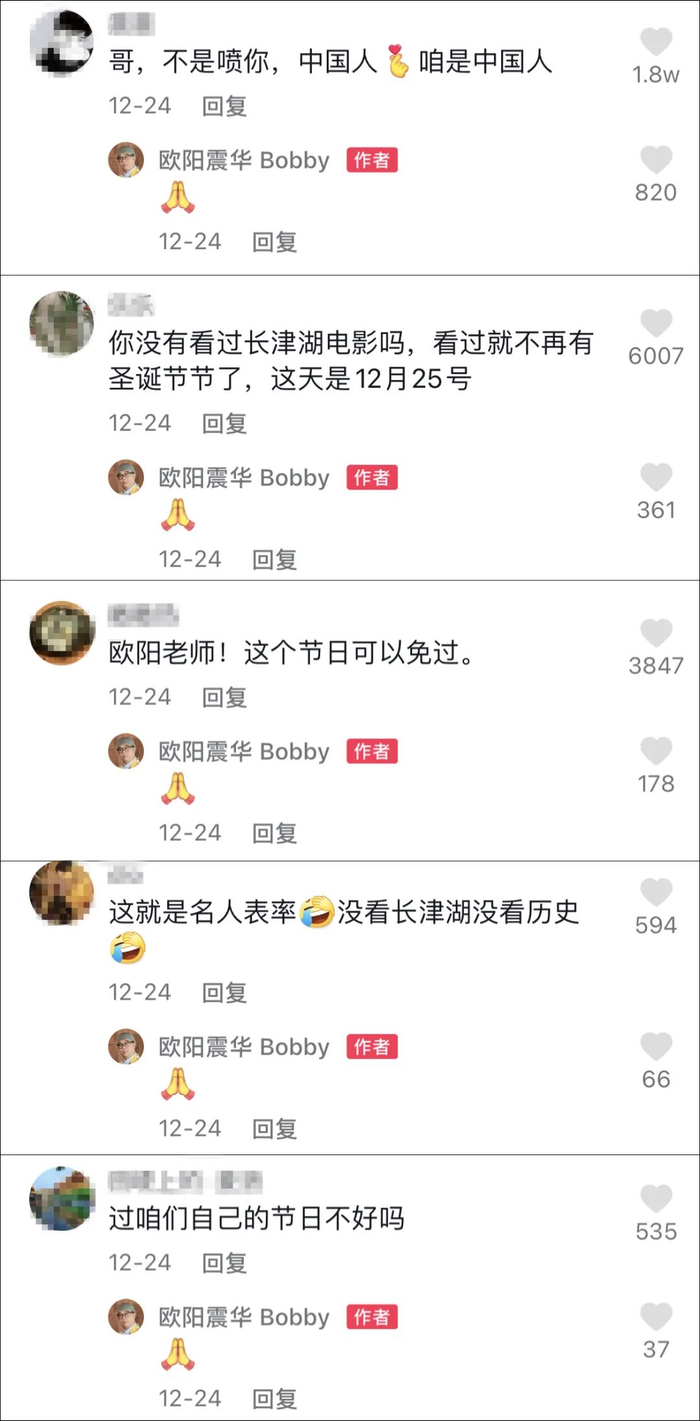相关动态发布后,评论区不少用户声称欧阳震华作为中国人不应该过圣诞节,还有人称其行为恐做出不好的“表率”。