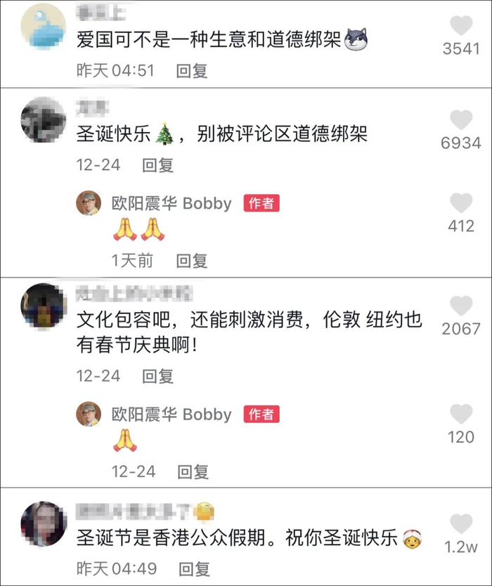 12月24日-25日,欧阳震华曾在社交平台分享其庆祝圣诞节的短视频,随后评论区不少用户声称其是中国人、“圣诞节可以免过”,欧阳震华均予以回复;期间也有不少用户认为,此事可用包容的态度来对待,不必因此苛责曾多次表明爱国立场的香港艺人。
