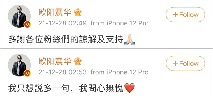 12月28日凌晨,欧阳震华在微博连发两条动态,疑似对庆祝圣诞节的争议作出回应。他称:“多谢各位粉丝们的谅解及支持。我只想多说一句,我问心无愧。”