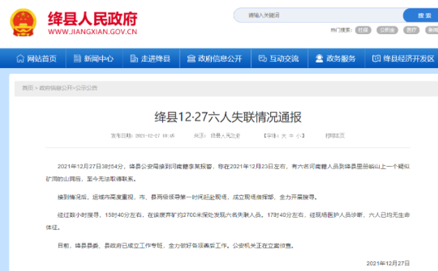 12月27日,山西绛县接警称6人在里册峪一带失联。经搜寻,6人在废弃矿约2700米深处被发现,已均无生命体征。警方初步调查,6人在关停的金矿内用洗洞的方法非法获利,目前已立案侦查。