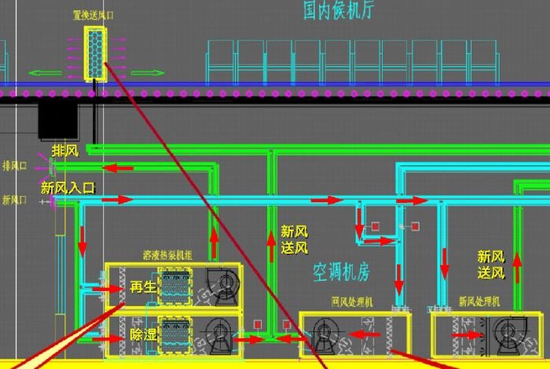 第一,溶液除湿系统没有用室内排风再生,用的是新风再生。因为T3航站楼的新风送风量仅够平衡厕所与厨房排风以及出入口渗风,如果再抽取室内空气进行溶液再生,就会导致大厅内空气被抽成负压,不符合规范标准。