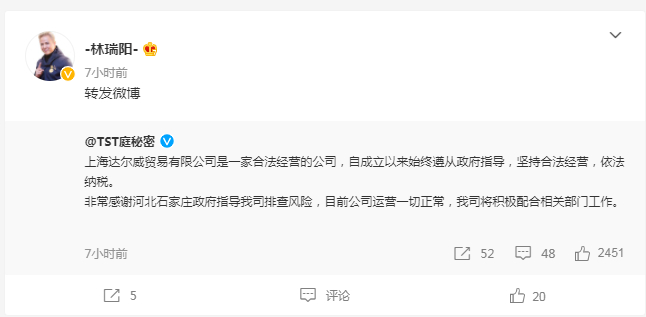 林瑞阳、张庭对此在个人微博上进行了转发: