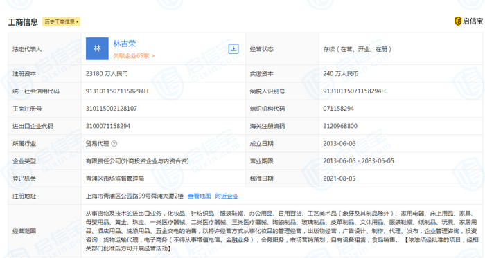 公开数据显示,上海达尔威贸易有限公司法定代表人林吉荣,即知名演员林瑞阳。林瑞阳有“台湾第一小生”之称,早年曾在琼瑶剧《一帘幽梦》等黄金档电视连续剧中饰演男主角。