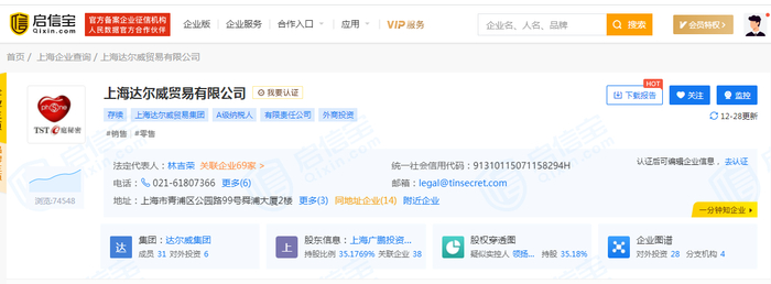 值得一提的是,达尔威是微商品牌“TST庭秘密”的运营主体,该公司实控人为张庭、林瑞阳夫妇。