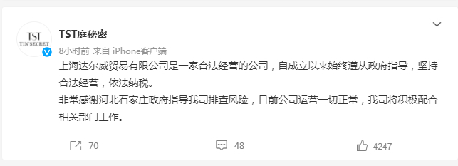 针对此时,29日凌晨,上海达尔威贸易有限公司回应,公司是一家合法经营的公司,自成立以来始终遵从政府指导,坚持合法经营,依法纳税。非常感谢河北石家庄政府指导公司排查风险,目前公司还在正常运营,也将继续配合相关部门的工作。