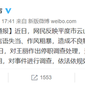 此前,平度市委宣传部26日发布情况通报称:问题发生后,平度市委高度重视,12月26日,对王丽作出停职调查处理,责令其向当事人赔礼道歉。平度市委已成立调查组,对事件进行调查,依法依规处置。