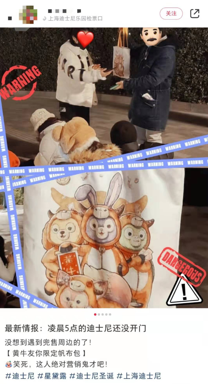 红星资本局注意到,小红书上,甚至有人在上海迪士尼门口兜售“黄牛有你限定帆布包”,以此反讽迪士尼监管不力。