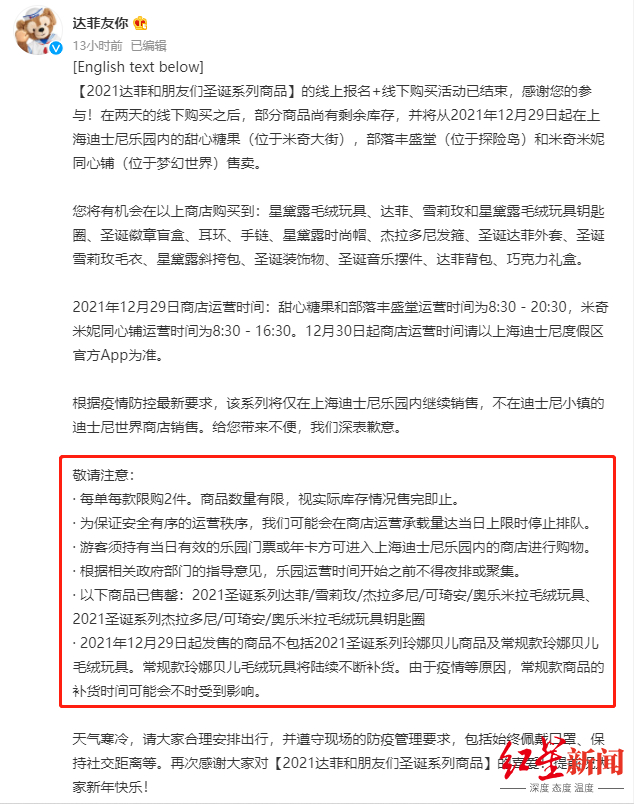 红星资本局获悉,12月28日,上海迪士尼度假区官微@达菲友你 发微博称,此前“2021达菲和朋友们圣诞系列商品”的线上预约+线下购买活动已结束。在经过两天的线下购买之后,部分商品尚有剩余库存,将从2021年12月29日起在上海迪士尼乐园内售卖。