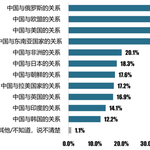 在回答“对中国影响最大的双边关系”这一多选问题时,过半(55.6%)受访者选择“中国与俄罗斯的关系”,中选率居第一;“中国与欧盟的关系”(44.9%)和“中国与美国的关系”(41.8%)中选率均超过四成,分列第二和第三位。中国与东南亚国家关系和中国与非洲关系列第四和第五位。