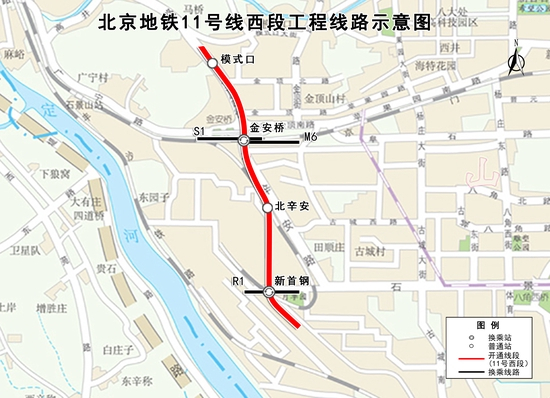 11号线西段是服务北京2022年冬奥会的轨道交通线路,同时也是北京市智慧轨道交通示范线。线路全长约2.5公里,设4座车站,其中换乘站2座,分别在金安桥站与北京地铁6号线、S1线换乘,新首钢站将与规划R1线换乘。11号线将在地铁内新增可视化的乘客召援系统,乘客不再需要找服务台,而是就近与站务人员实现视听咨询对话,还可实现5G信号全覆盖。服务于北京2022年冬奥会的11号线西段的车厢内外采用蓝白两种色调,车厢内车顶的照明灯设计成了雪花绽放的造型,车门口的扶手杆设计成了冰球杆的造型,开通后,北京冬奥会北京赛区所有比赛场馆将全部可以乘坐地铁抵达。