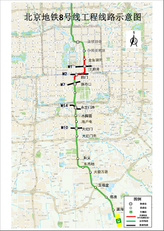 8号线三期剩余段全长约4.6公里,设3座车站,其中可在王府井站与1号线实现换乘,在前门站与2号线实现换乘。随着剩余段的开通,8号线将成为北京市中轴线上的交通动脉,届时乘客可乘8号线直达前门、王府井等商业旅游区。