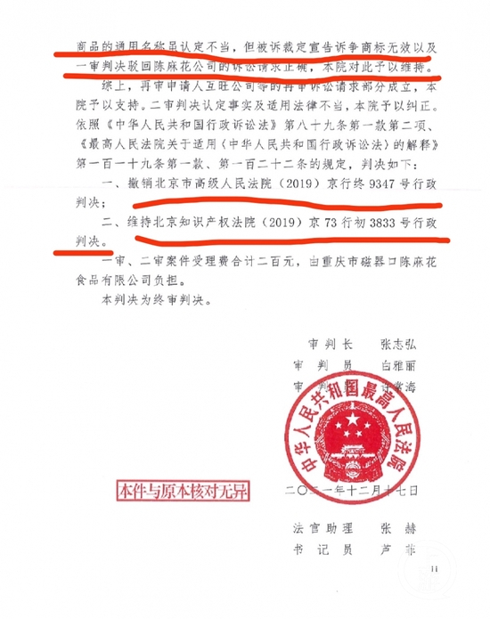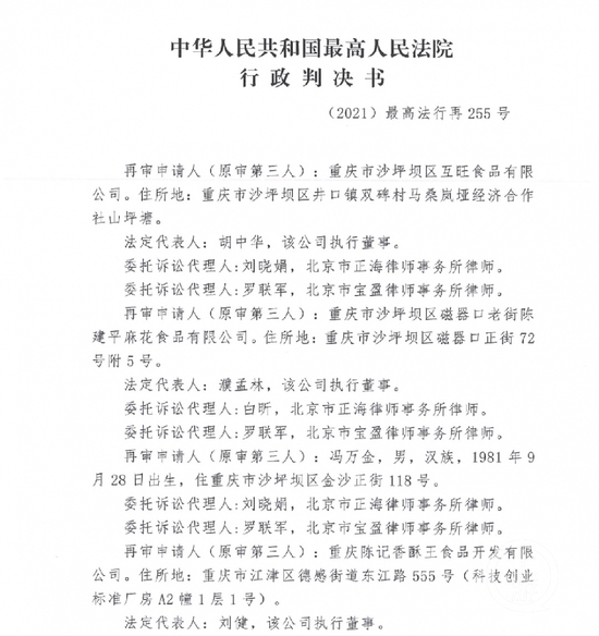 12月29日,上游新闻记者从最高人民法院12月17日作出的(2021)最高法行再255号行政判决书看到,该判决书载明,这场再审官司中,再审申请人有五家,乃原审第三人,分别是重庆市沙坪坝区互旺食品有限公司(以下简称“互旺公司”)、重庆市沙坪坝区磁器口老街陈建平麻花食品有限公司、冯万金、重庆陈记香酥王食品开发有限公司、重庆大渝人食品有限责任公司。