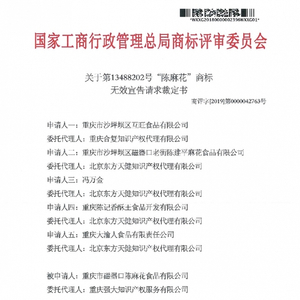 原国家工商行政管理总局商标评审委员作出《关于第13488202号“陈麻花”商标无效宣告请求裁定书》,裁定诉争商标予以无效宣告。