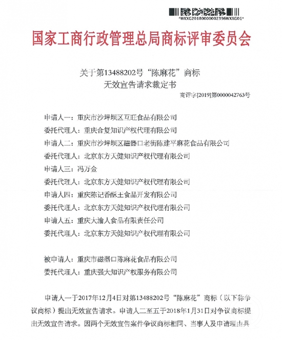 在磁器口经营麻花的五家商户先后向原国家工商行政管理总局商标评审委员会对“陈麻花”商标提出无效宣告请求。