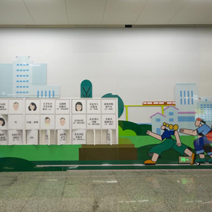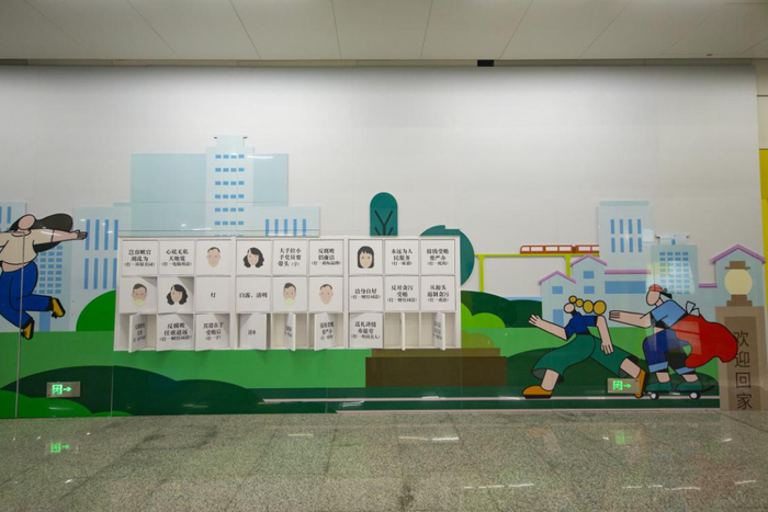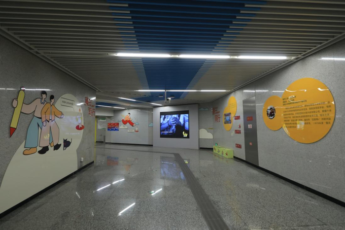 幸福广场站1号出入口在该站1号出入口,通过卡通插画、先进典型、活动照片等围绕青年廉洁、幸福人生历程,诠释青年人应厚植廉洁根基内涵。