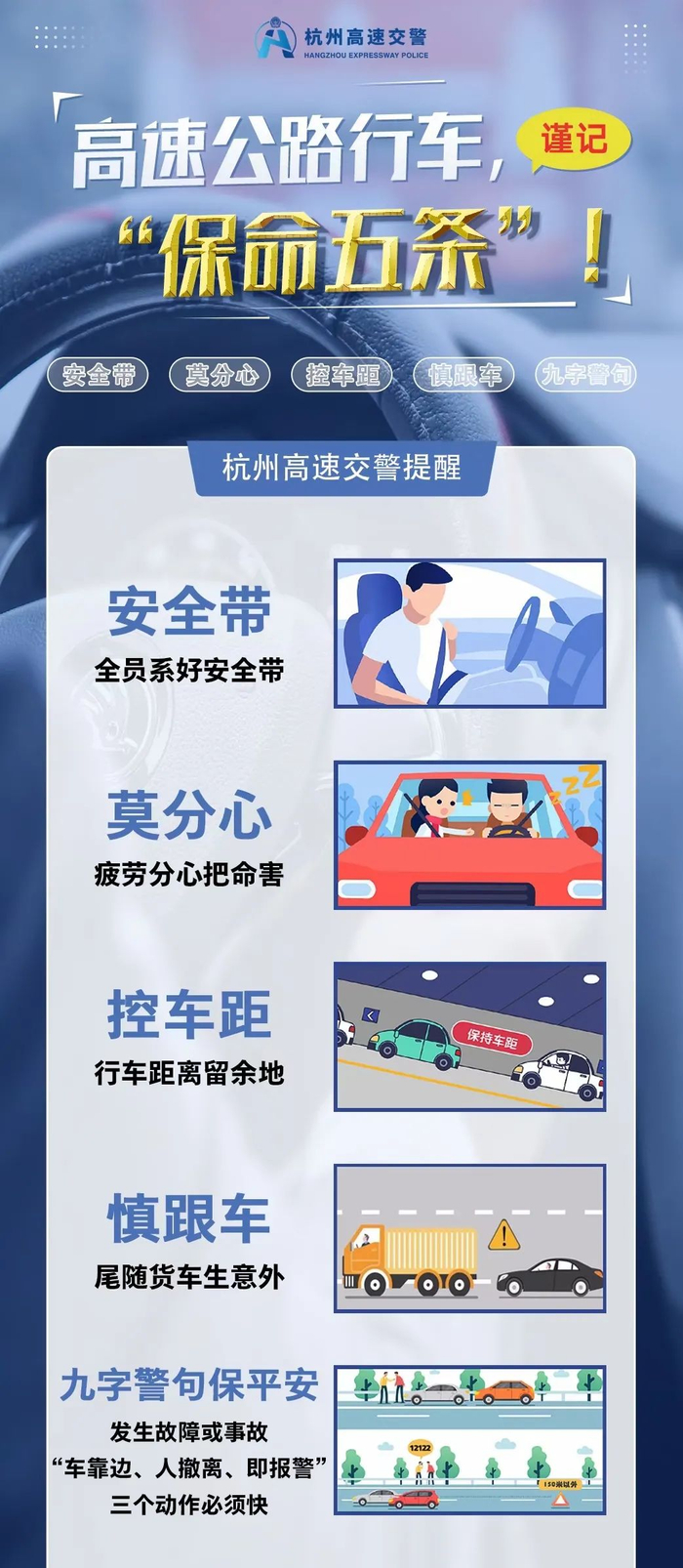 安全带、莫分心、控车距、慎跟车、九字警句保平安;全员系好安全带,疲劳分心把命害,行车距离留余地,尾随货车生意外,发生故障或事故,“车靠边、人撤离、即报警”,三个动作必须快。