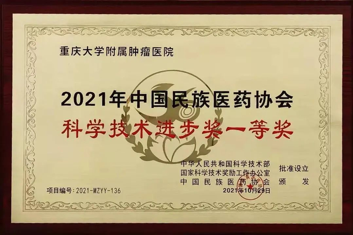 热烈祝贺重庆大学附属肿瘤医院王维团队荣获2021年中国民族医药协会科学技术奖一等奖