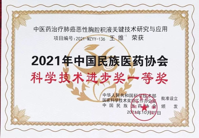近日,中国民族医药协会发布2021年中国民族医药协会科学技术奖名单发布,重庆大学附属肿瘤医院作为完成单位,中医肿瘤治疗中心主任王维作为第一完成人申报的项目“中医药治疗肺癌恶性胸腔积液关键技术研究与应用”荣获科学技术奖一等奖。