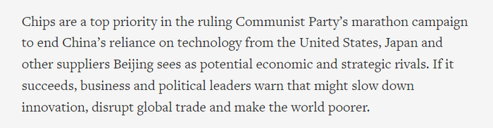美联社在28日的报道里称,中国官方正推动几大科技巨头针对我国较为薄弱的科技领域加大投入,力求能尽快摆脱对外国芯片等核心技术的高度依赖。而如果中国成功实现了这一目标,就会“妨碍全球创新、破坏自由贸易,会让世界经济脱钩和分裂。”