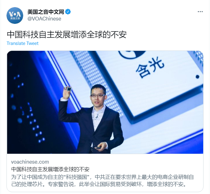 一般来说,“美国之音”在反华的姿态上,总是比其他西方媒体要更激进一些,但这次把中国科技自主发展和“中国威胁论”联系起来的消息源头,反倒是自诩“中立主流媒体”的美联社。