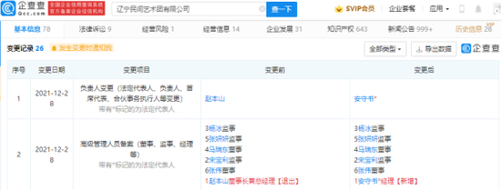 企查查APP显示,12月28日,本山传媒关联公司辽宁民间艺术团有限公司发生工商变更,赵本山退出法定代表人,由安守书接任,同时赵本山退出董事长兼总经理职务。