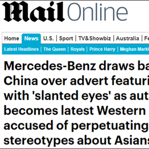 报道表示,奔驰在其新款CLS豪华轿车广告中使用了画着吊梢眼式妆容的女性模特,这在中国社交媒体上被用户猛烈抨击。文章引用《环球时报》的报道,指出中国网友愤怒的原因是,“模特的妆容反映了西方对亚洲人的刻板印象”。