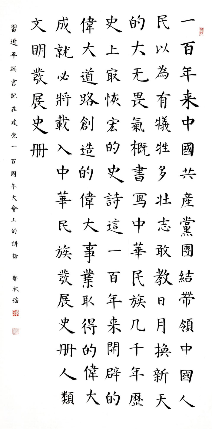 为庆祝中国共产党成立100周年,贯彻落实习近平总书记关于文艺工作的重要论述和指示精神,以书法艺术的形式表达对党对国家的深情赞美与热爱,大力弘扬中华优秀传统文化,充分展示我市青少年的魅力风采以及良好精神风貌,坚定文化自信,推动兰州市文化艺术的繁荣与发展。由兰州市教育局 、兰州市文联、 共青团兰州市委、兰州日报社 、兰州广播电视台 、兰州市校外教育办公室 、 兰州互联网新闻中心(中国兰州网)主办,兰州市书法家协会 、兰州市少年宫 、兰州市东郊学校承办,兰州市五区三县校外教育办公室协办的兰州市第九届青少年书法现场大赛原定于2021年9月下旬在兰州市东郊学校举行,由于疫情原因,经主办单位协商决定,现场大赛改为网络大赛,活动定为向三县五区的中小学生征集作品,并将优秀作品在相关网络平台展示,原定截稿时间为10月31日,而后活动仍受到疫情的影响,主办方再次向各学校发了补充通知,截稿时间定为12月10日。最终收到有效投稿1100件,作品涵盖了篆、隶、楷、行、草五种书体,经兰州市书法家协会组织评委在兰州市少年宫公平、公正、公开评选,共评出小学组、中学组、高中组获奖作品68件,入展作品194件(含获奖)。本次大赛主题为“我和我的祖国——感党恩•庆国庆•颂盛世”,大赛以讴歌党、讴歌祖国、讴歌人民、讴歌英雄、讴歌时代和弘扬传承中华优秀传统文化为主线,以中国共产党建党百年经典语录,习近平总书记在中国共产党成立 100 周年大会上的重要讲话和关于文艺工作的重要论述和指示精神,兰州市创建全国民族团结进步示范市相关内容,有关兰州的诗词、对联为书写内容。本次评选出的194件(含获奖)入展作品形式多样,书写内容主题鲜明,集中体现市书法家协会开展未成年人思想教育和书法进校园活动所取得的成果,充分展现了我市的中小学生积极向上的精神面貌和爱国主义情怀,同时,活动为贯彻我市第十四次党代会精神提出的“黄河少年、振兴有我”做出积极贡献。