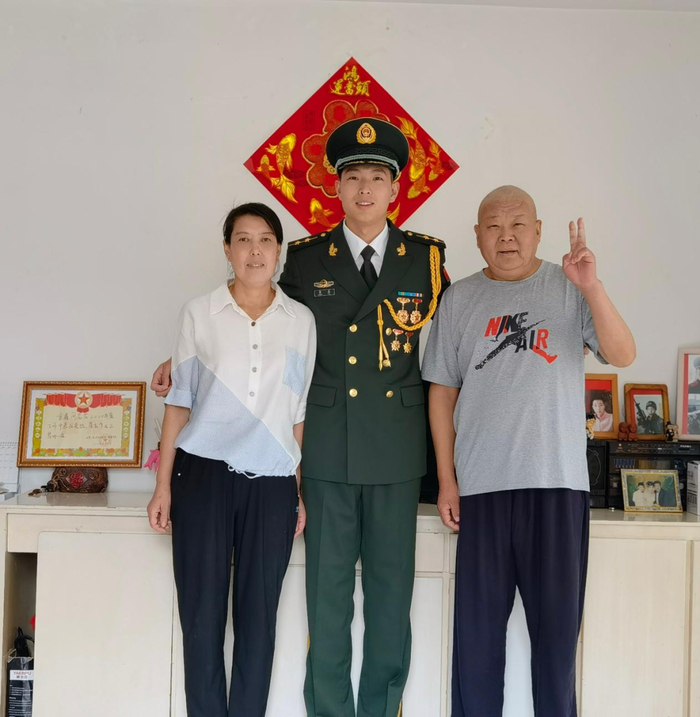 今年回家,第一次身穿军装和家人合影。大病初愈后的爸爸,比出了“耶”的手势。离家千里,我深知他们的思念,他们也懂我的努力。