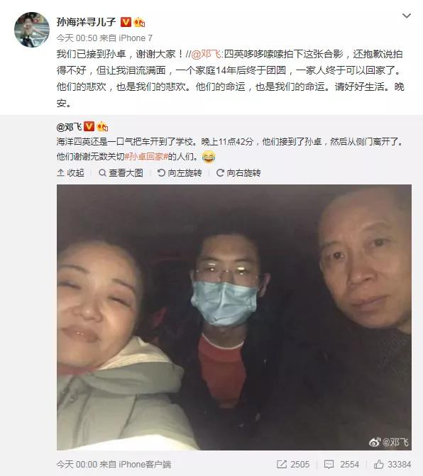 “海洋四英还是一口气把车开到了学校。晚上11点42分,他们接到了孙卓,然后从侧门离开了。谢谢无数关切孙卓回家的人们。”