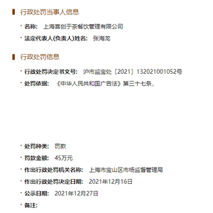 国家企业信用信息公示系统显示,近日,上海市宝山区市场监督管理局日前发布关于新茶饮品牌喜茶关联公司上海喜创于茶餐饮管理有限公司的行政处罚决定书。因广告所宣称的部分内容与实际情况不符,该公司被罚45万元。针对该处罚,喜茶方面尚未回应。